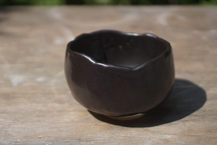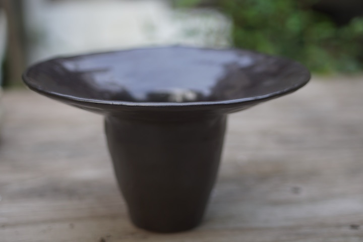 黒土にマンガンで作った黒釉、トルコ青、色ガラスを使った作品です。黒の中に微妙な変化が見えてきます。電動轆轤の性質を生かし、独特な形に作り上げています。だんだん説得力が出てきた気がします。