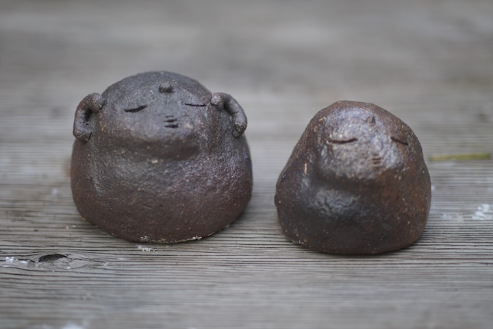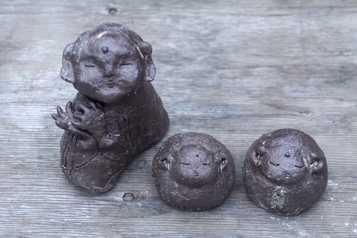 陶のお地蔵さま。やっさしい氷上をされています。頁岩土という鉄分のたいへん多い土を使い、鞘に入れて焼き締めました。窯の一番温度の低い位置に鞘を置いたのですがまだ温度が高かったようです。