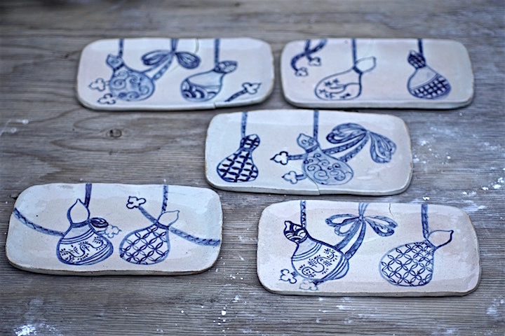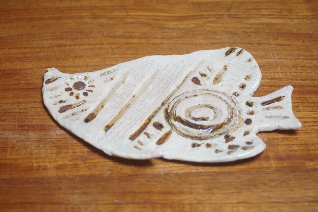 いつもユニークで愛らしい作品を作られているESさんの作品です。赤土に半透明の白釉を使いました。3枚目の作品は仲良しの2匹のお魚、とても可愛い作品です。