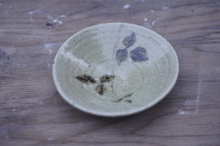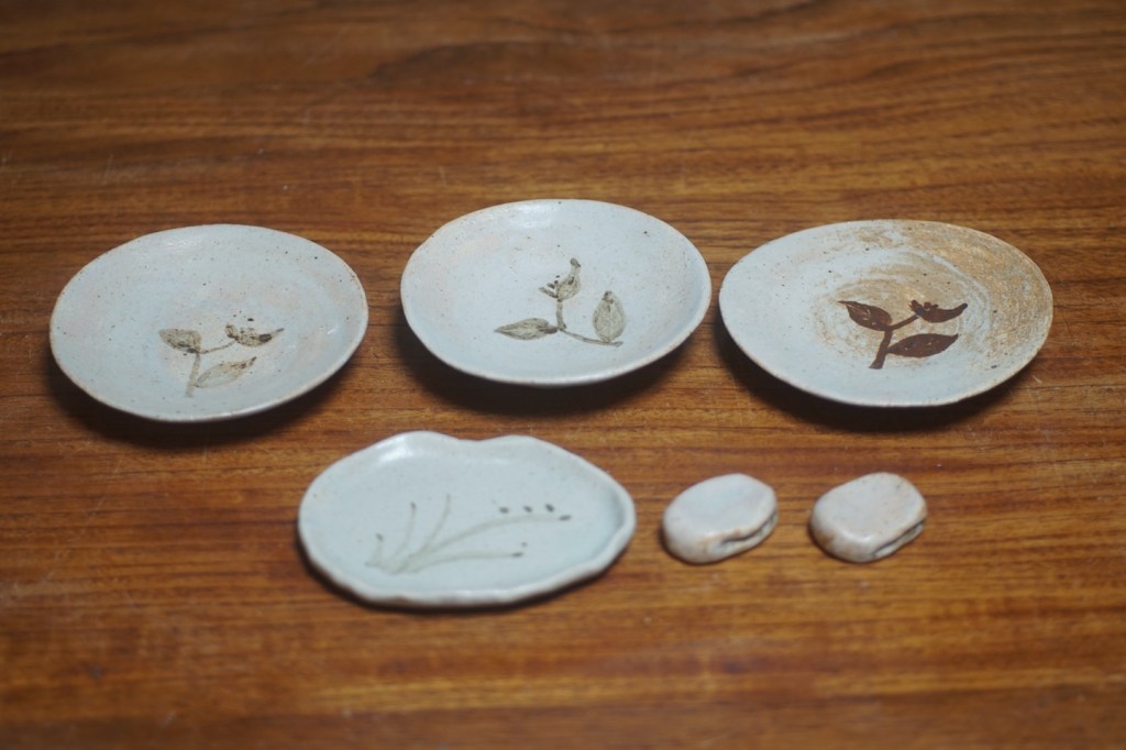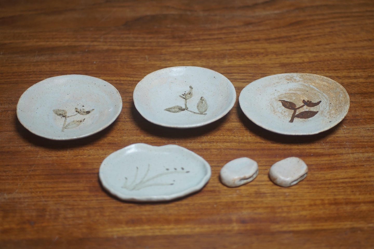 小皿は全て手びねりで作られています。鬼板の絵付け、丁度良い濃さで描くのは難しことです。ちょっとした濃さの違いで濃淡がはなりはっきりと表れます。下の小さな作品はそら豆の形をした箸置き。オリジナルの半艶恵那山土灰釉を使い本物のそら豆そっくりな色になりました。