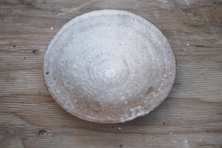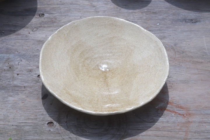 電動轆轤で大きな作品に挑戦しています。赤土で作った大鉢。天然藁灰を使った白萩釉。どっしりと存在感のある作品です。