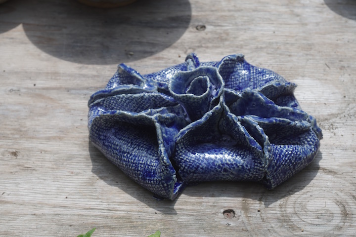 小学5年生のSYちゃん。珍しく白土にペルシャ青と青いガラス粉を使った鮮やかな作品を作りました。電動轆轤も慣れてきました。
