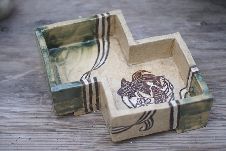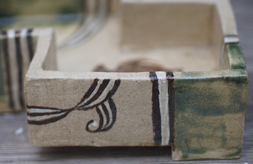 板作りの角皿。こちらも素焼き後に使える化粧土を使っています。上の丼とは違いこちらは塗り掛けの化粧土がはっきりしています。鉄分が多い天然木灰を使ったからなのか、置かれた窯の位置によるものなのか。陶芸はまだまだ分からないことだらけです。