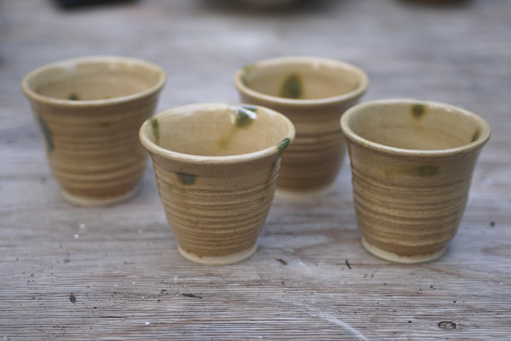 電動轆轤成形したコップ。同じ形を作るのは難しいことですが雰囲気が揃っていれば良いと言われています。工業製品とは違い少しずつ違いがあるのは当たり前のことです。土灰釉を酸化焼成させ黄瀬戸調にし織部釉を散らしています。