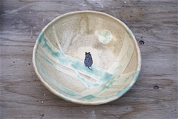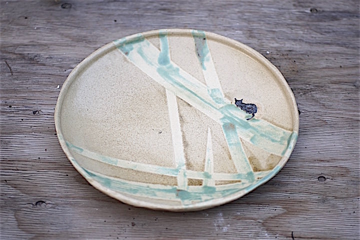 猫好きなYFさんの作品。板作りの答弁を型に貼り付けて成形した作品です。時間をかけて撥水剤とマスキングテープを駆使して作っています。黄瀬戸のようなベージュ色の背景と青磁色を使いたいということで酸化で青磁の様な色になる釉を作りました。猫の後ろ姿がなんとも言えない哀愁を感じさせるユニークな作品です。