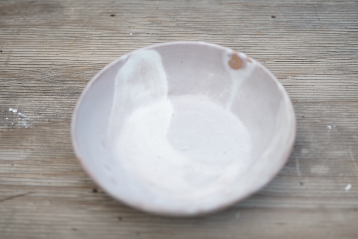 電動轆轤引きした鉢。赤土を使い、素焼き後使える白化粧土と土石白萩釉を掛けました。白萩の半透明な特徴を生かしたいろいろな白が綺麗です。