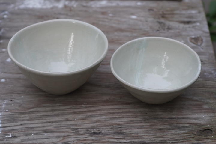 電動轆轤挽きの丼、高台を付けず洋風に仕上げました。素焼き後に使える白化粧土を藁を束ねた筆で塗りました。胎土が白いので写真では分かりません。淡い天然土灰の青磁が綺麗です。