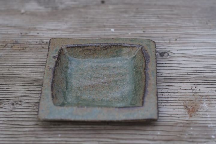 テクスチャーに拘った角皿。新しく調合した天然土灰釉を掛けました。凹んだ部分に還元されて溶けた釉が暑く溜まり、独特な発色になりました。