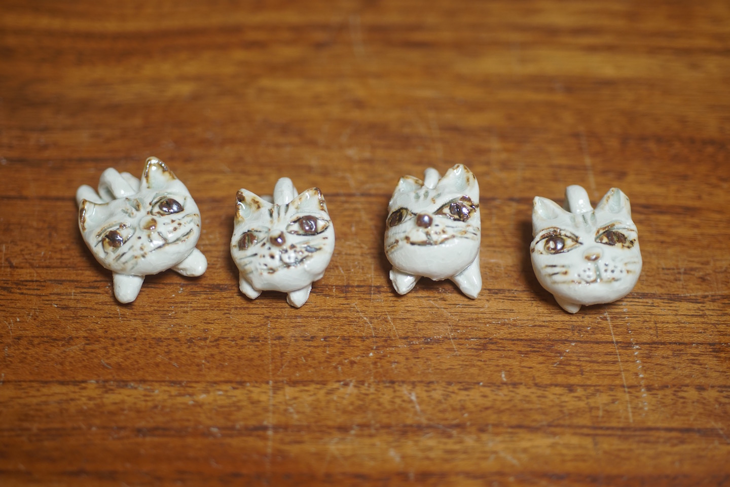 首飾りのパーツの猫ちゃんです。よく見ると一つ一つ違った顔をしています。手作りならではの作品です。
