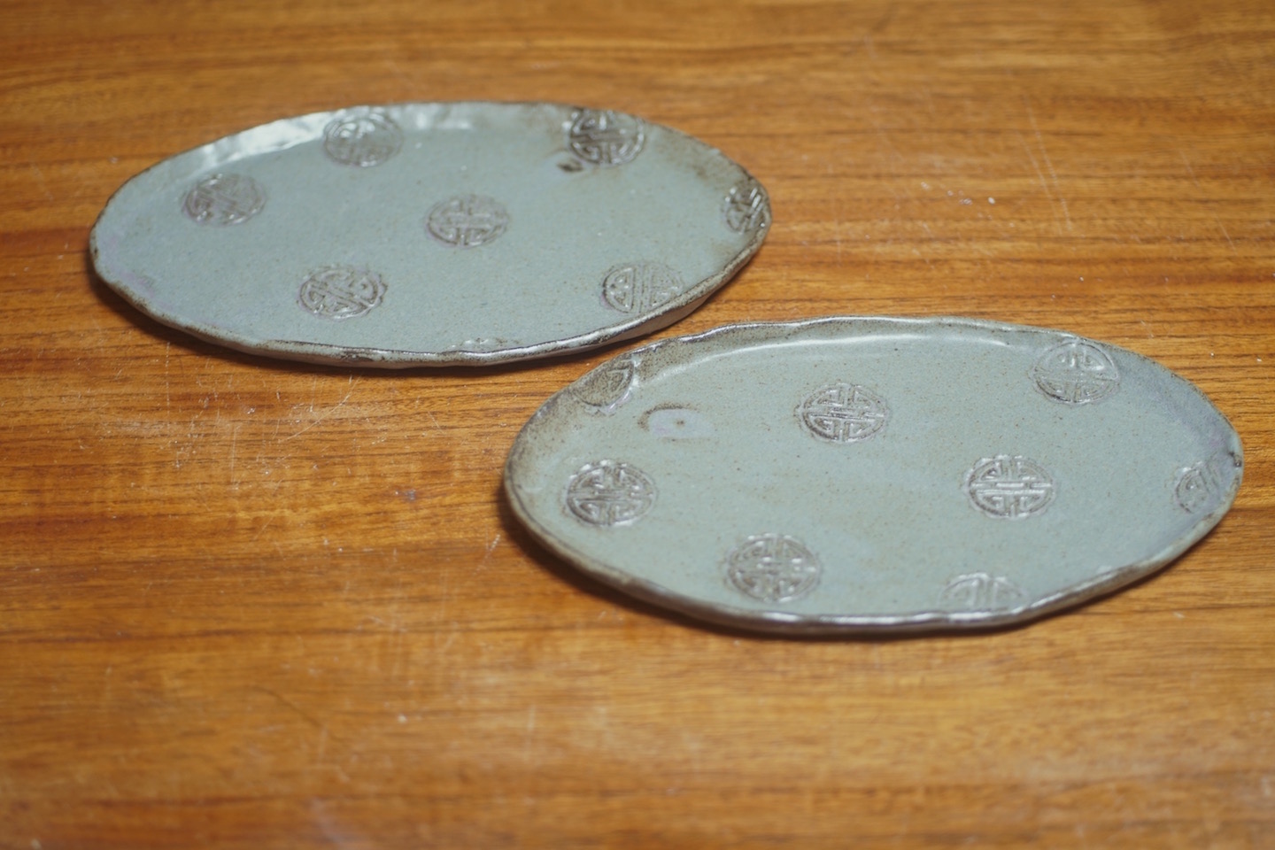 お揃いの楕円形のお皿。天津のお教室をなさっているCDさん、中華の刻印を文様にしました。涅につや消し天然土灰釉を釉掛け、還元焼成です。もっと青磁色が強く出ると思ったのですが黒土の強い黒が勝ってしまいました。なかなか思うようにはいかないです。
