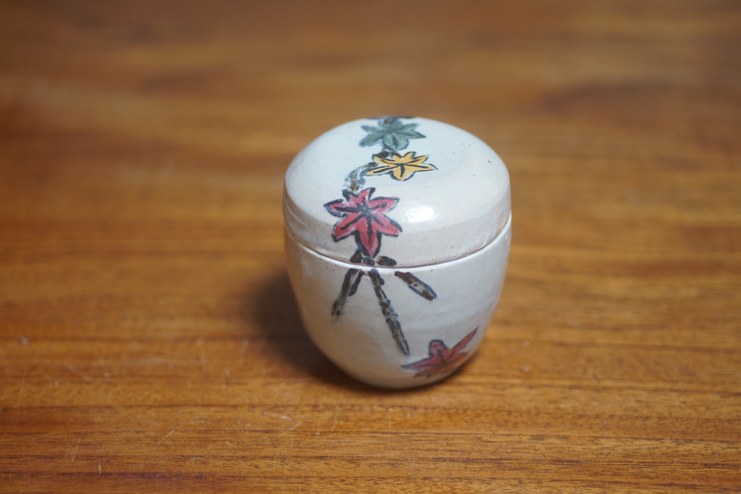 手びねりの香合。蓋と本体は殆ど遊びが無くぴったりと収まります。合わせの部分にアルミナを塗っていただき重ねて焼いたので、釉の色も揃っています。絵付けの紅葉も丁度良い発色です。