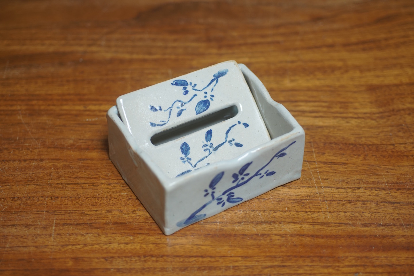 板作りの呉須で染付けしたティッシュペーパー入れです。蓋の重みで髪を抑える機能があります。絵付けの色の濃さも丁度良いと思います。
