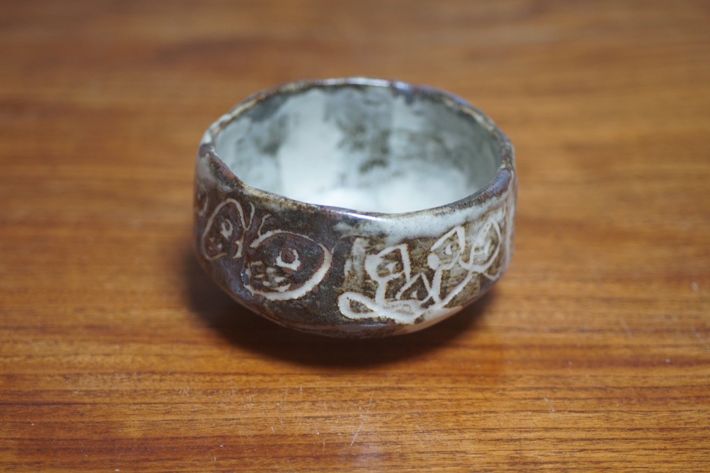 電動轆轤を使いかなり薄く軽く作られた器です。小覚醒が作ったとは思えないほど渋い味のある作品。赤土に天然土灰釉をかけました。