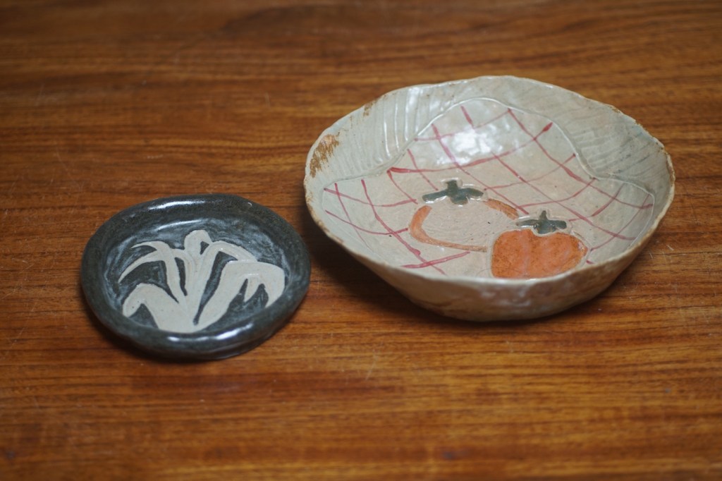 HOちゃんのお母様の作品。加飾や使った釉は同じですが、違った発想で仕上げています。縁の緑色は紫月窯オリジナルの千倉石を使った釉です。
