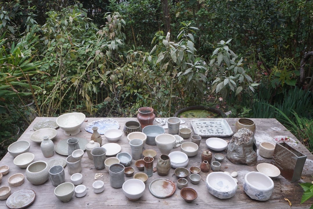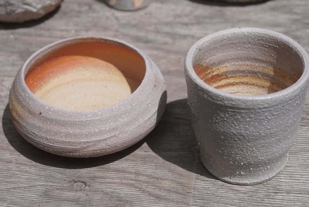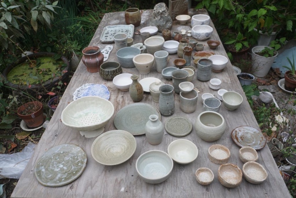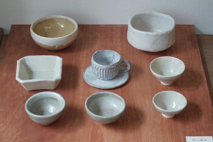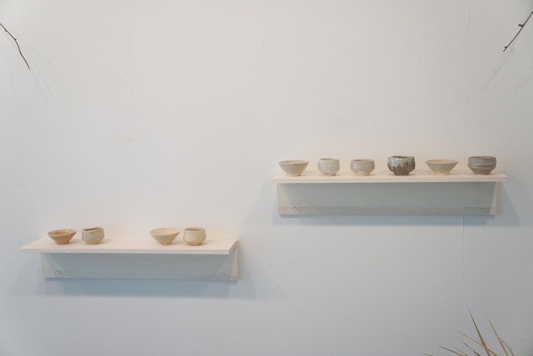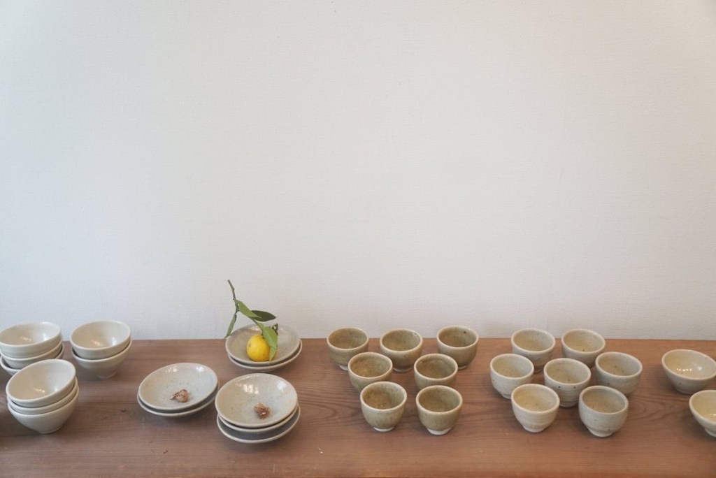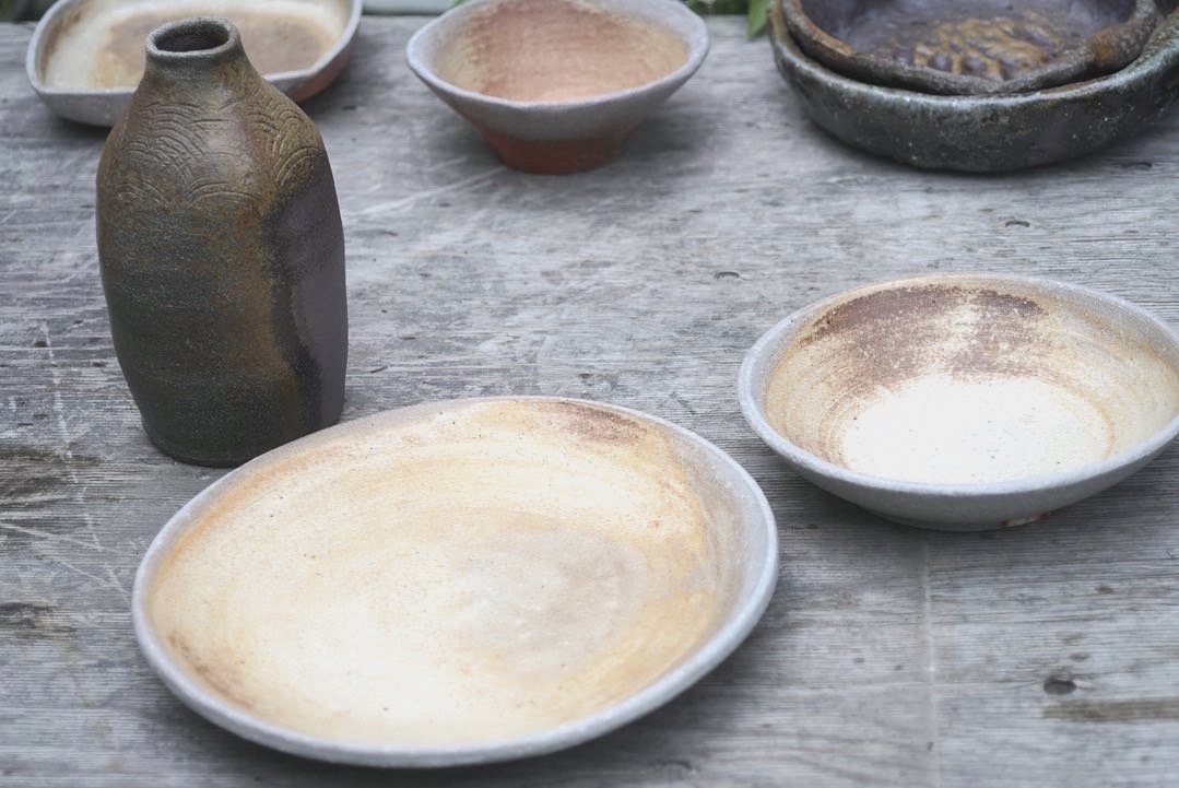 様々な日常使いの雑器。いろいろな土、いろいろな天然の木の灰を使った釉を施釉しました。紫月窯に入って初めて土に触れ、大変研究熱心に取り組まれています。静岡の実家で貰ってきた梨の木の灰を調合した自作の釉も使いました。