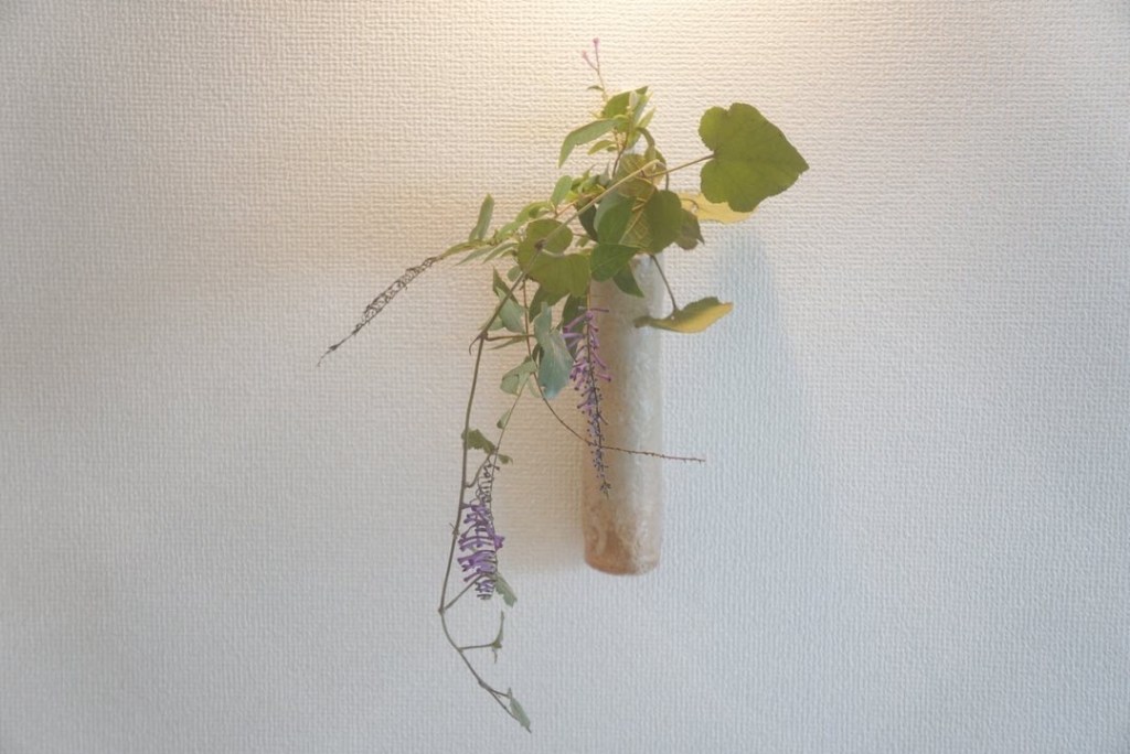 初心者コースですが、積極的に独創的、実験的な作品を作っています。中央に挿した花の茎が見えるデザインの花器です。