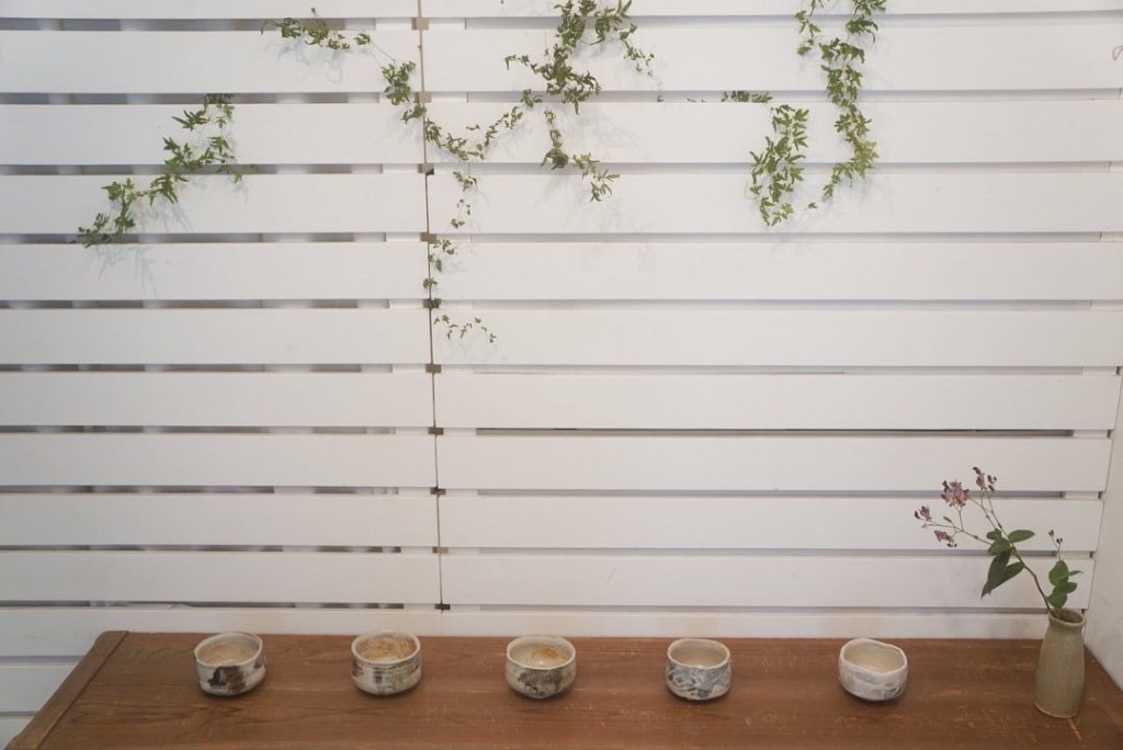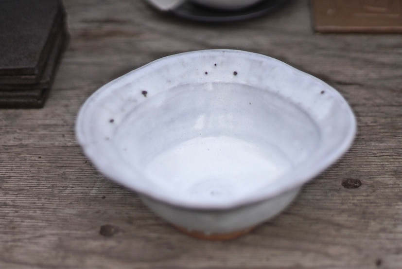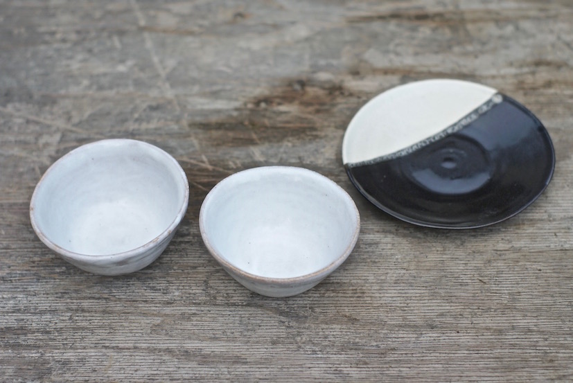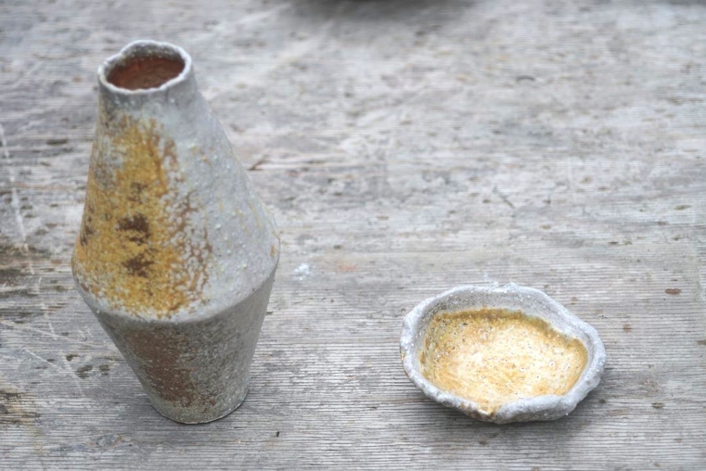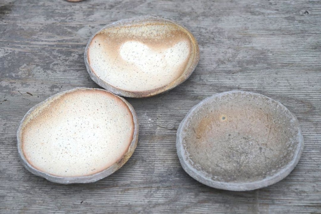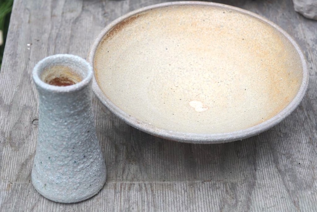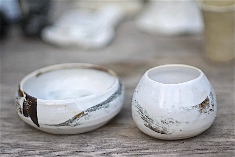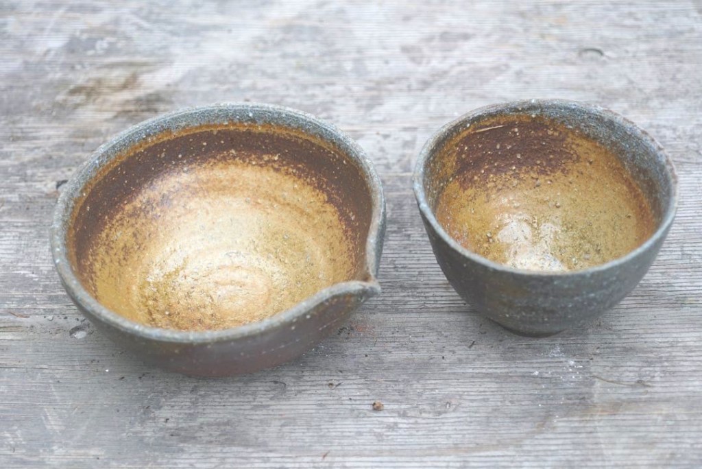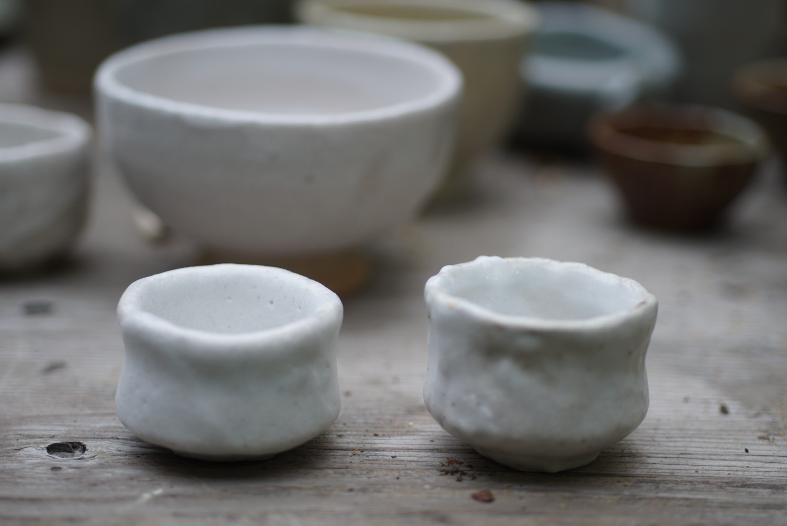 後ろの作品は使いやすそうなボウル、恵那山土灰を調合した艶消の釉を使いました。柔らかな感じの青磁色に焼けました。手前の小さな器は白化粧をし、蜜柑の灰を調合した釉をかけました。