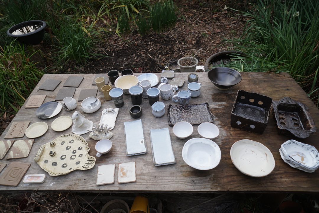 11/8の還元焼成、窯出ししました。還元が強く掛かりました。ねらしを長めにし過ぎたようです。釉が溶け過ぎた作品が多いです。焼成、難しいです。貴重なドイツから送られたプラムの木の灰、好奇心の強い生徒さん達が様々な土で作った作品に施釉しました。非常に土の性質に敏感でまるで同じ釉を掛けたとは思えないほどでした。
