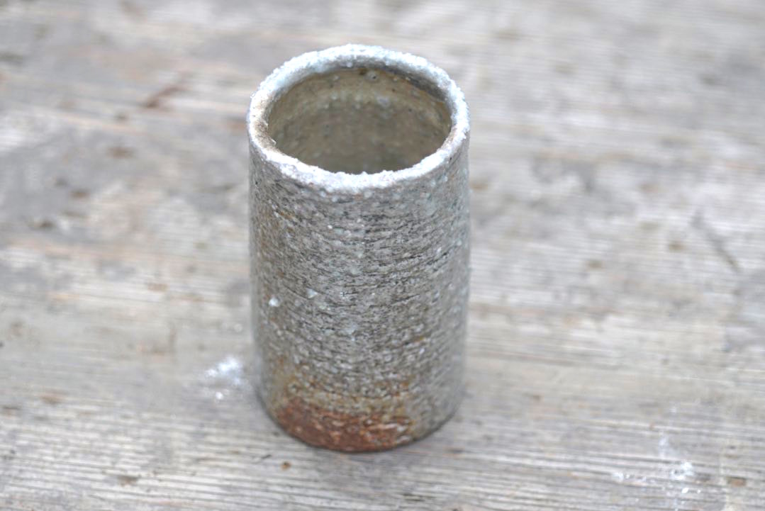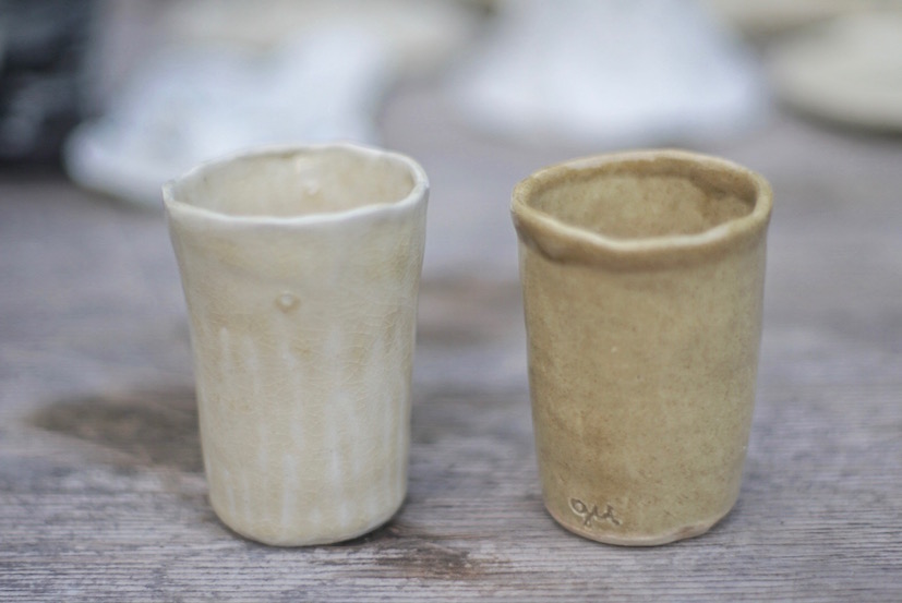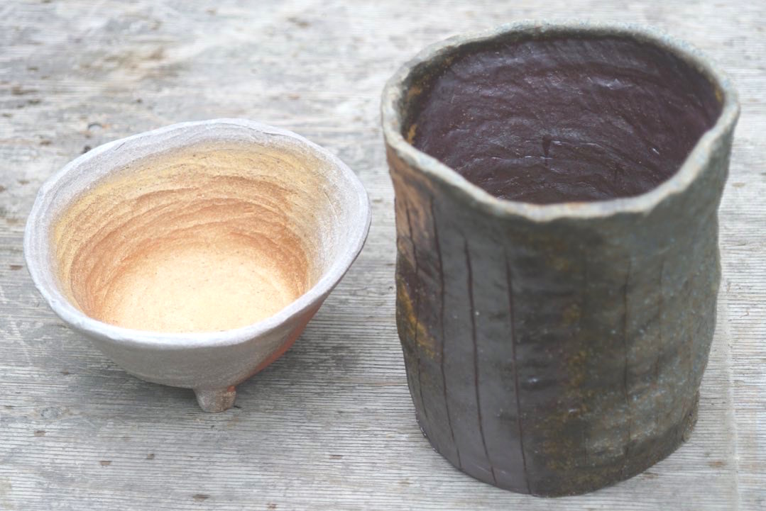 手びねりの二つの背の高いコップ。酸化焼成なので暖かい暖色系の色を希望されました。左は赤樫の杯を調合した釉。還元焼成すると鉄分が多く、濃い緑色に発色します。なので酸化では黄瀬戸のような色になると思ったのですが意外と明るい色に焼けました。右は杉と檜を混ぜた灰に酸化鉄を少し加えたオリジナル釉です。