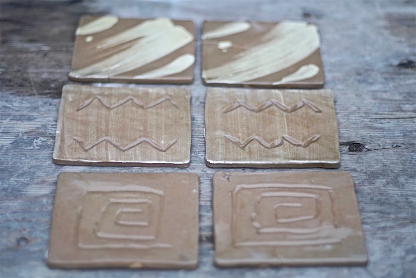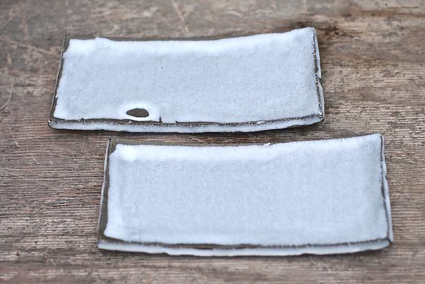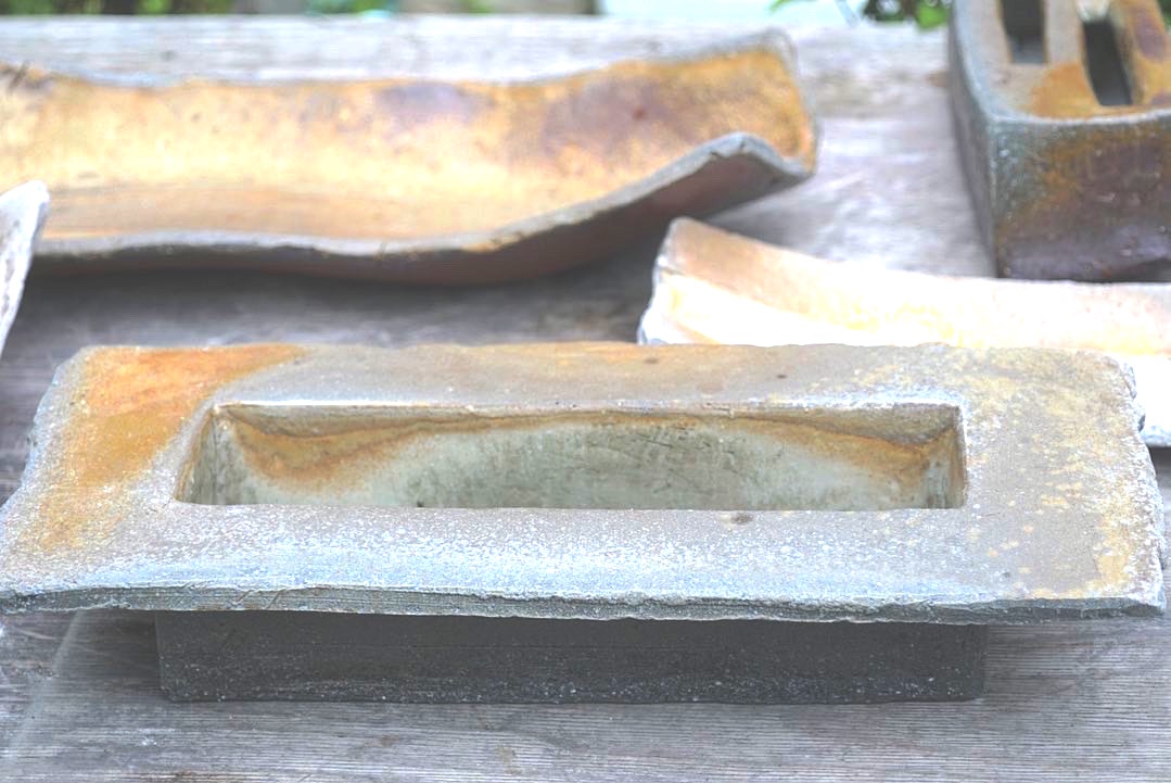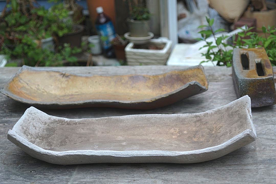 初心者コースの手びねりの課題がほぼ終わり、板作りの課題に入りました。上の作品は土の固まりをスライスして何枚か同じ形を作りました。土は赤土、釉は透明釉です。下は一枚一枚ローラーを転がして作りました。土は黒土、釉は亜鉛釉です。板作りは簡単そうに思えますが、ヒビが入ったり反ったりとリスクは高い作陶法です。