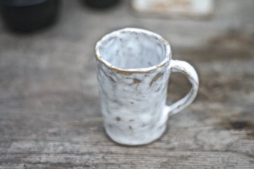初心者コースの課題。NOさんが作った取っ手のあるマグカップです。手びねりで赤2号土にオリジナルの亜鉛釉を施釉しました。釉が落ちた部分がありますが味があって良いと思います。