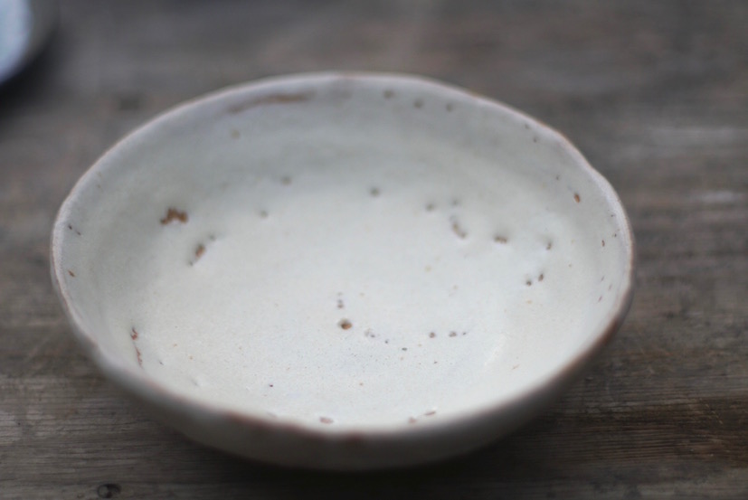 手びねりの大きな壺と小皿。いつも丁寧に手びねりならではの温かみのある作品を作られています。壺は流し掛けで釉の自然な流れで変化を作っています。釉は貝殻の灰を使った紫月窯オリジナル釉です。販売店では石灰と同じだとの事でしたが、かなり珪酸の成分が多く柔らかく白濁しました。