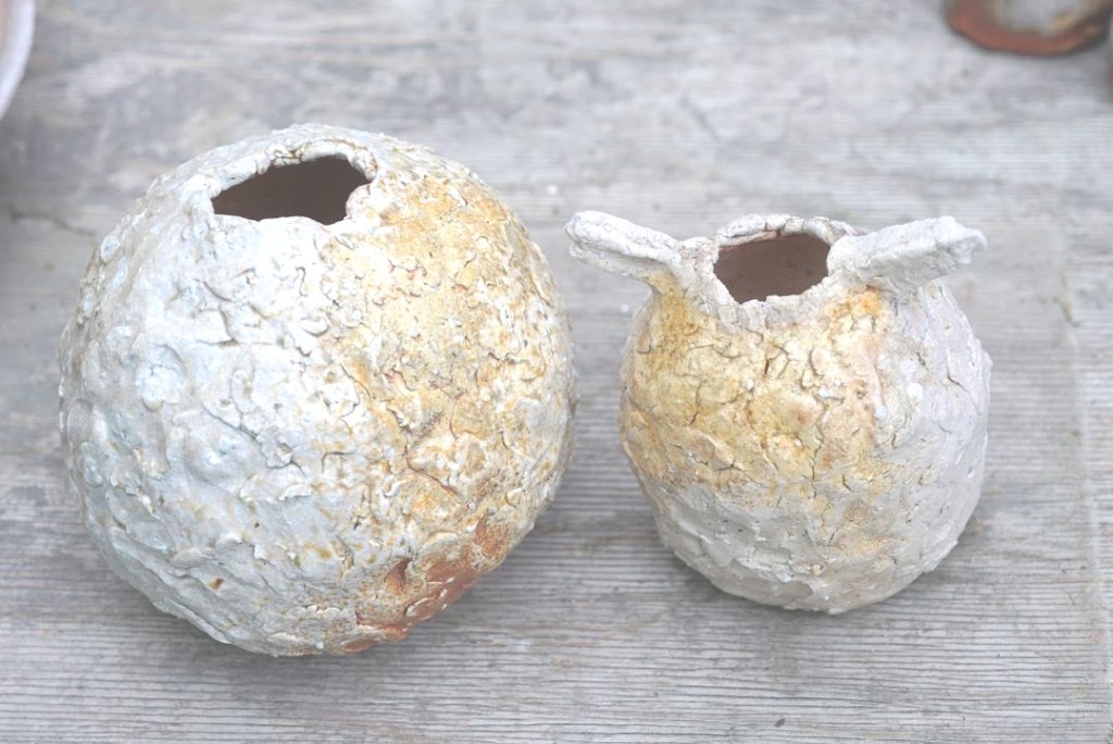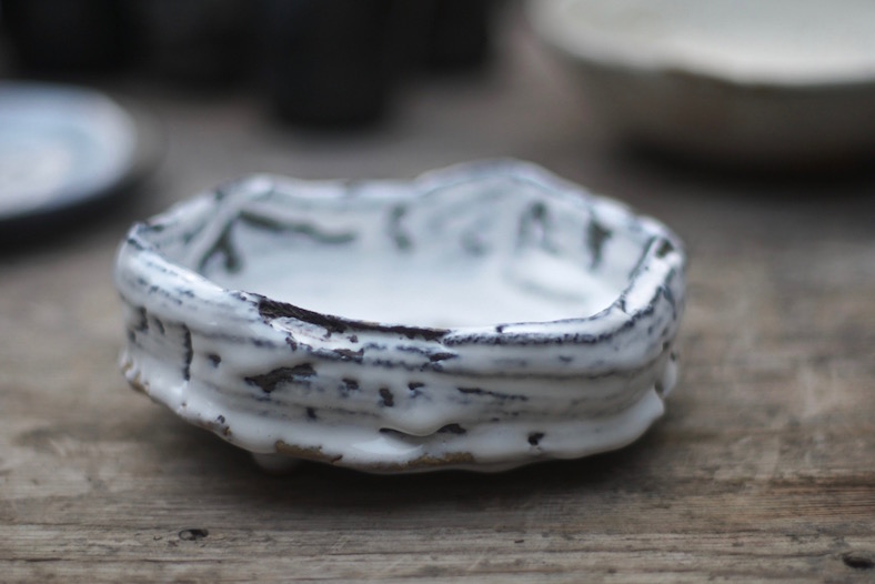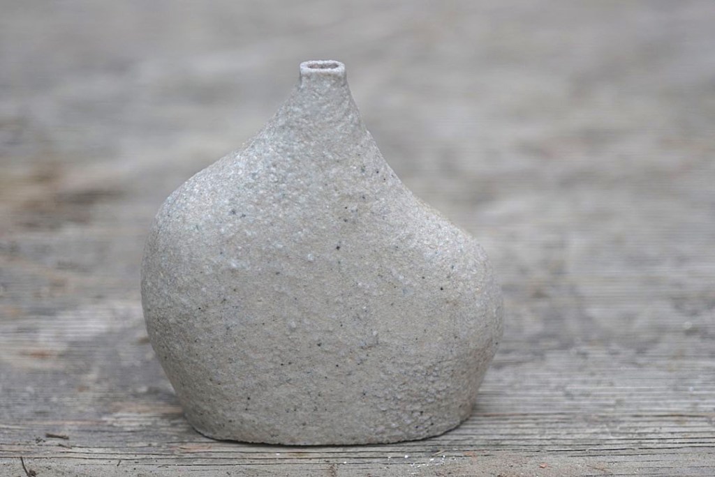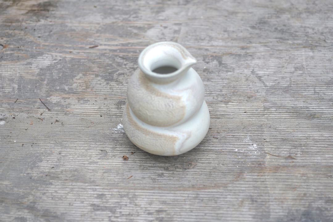 手びねりのユニークなフォルムの花器。長石単味の釉がけをしました。長石を単味で使うのは志野ですが、独特なテクスチャーはいろいろと展開できそうです。
