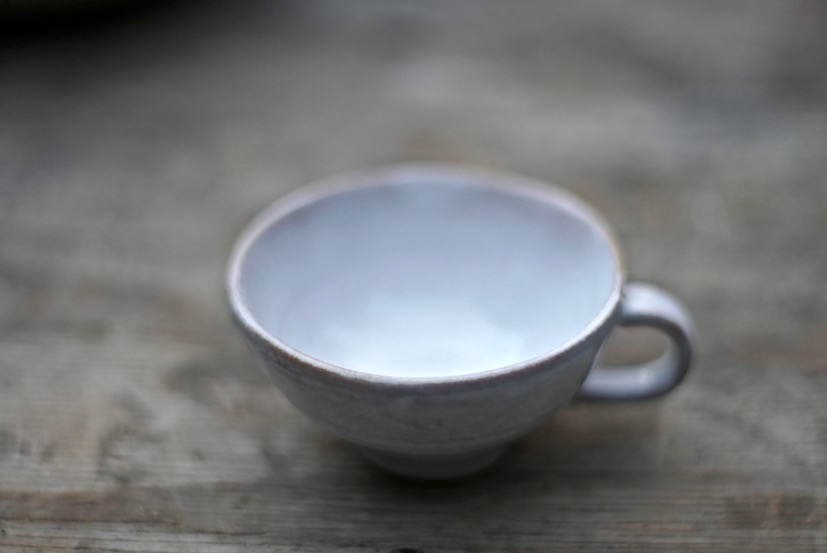 電動ろくろ成形のカップ。鉄分の少ない赤土に紫月窯オリジナルの亜鉛釉を施釉しました。丁寧に仕上げたれた優しい色合いの作品です。