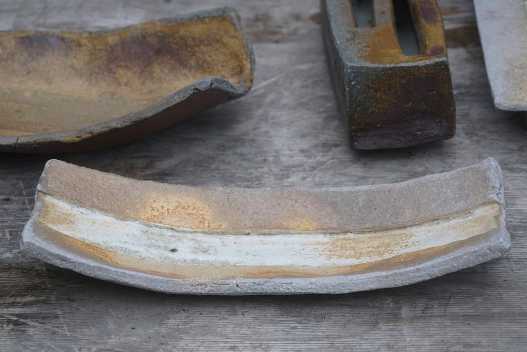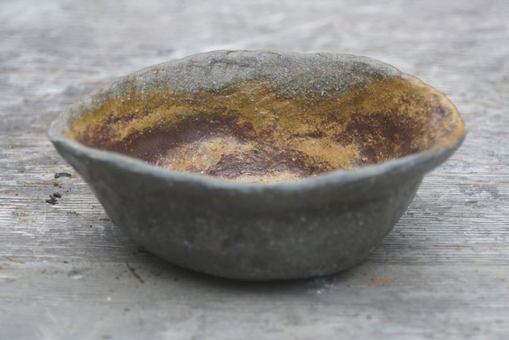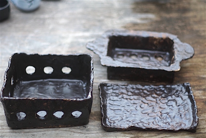 水と炭火を使って調理をするための器具を作りました。板作りで指の跡を残して素朴な感じに仕上げました。土は山中陶土の槇窯に使う耐火性の高いプレミア、釉は玉石釉です。窯の高い位置に詰めたので光沢がでています。
