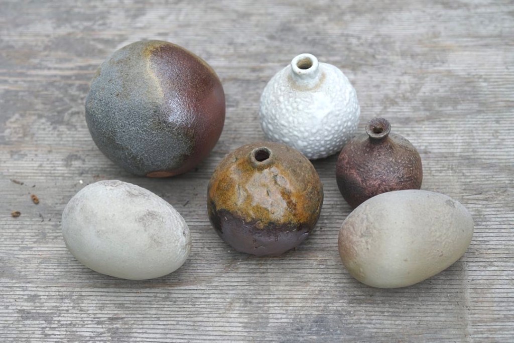 今回は茶道の茶碗や花瓶を除き、全て轆轤を使わない作品を展示いたします。なるべくシンプルな形の器に蜜柑、葡萄、プラムなど様々な天然の木の灰を独自の調合をした釉を掛けた作品です。