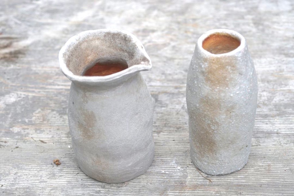 いつも多作されているTYさんの個性的な作品。今回焼成したのは赤土を電動ろくろ成形し作品。白い作品は風化長石単味の釉を掛けた物。胎土の赤が残っている作品は杉と檜を混合した灰を調合した釉で仕上げています。