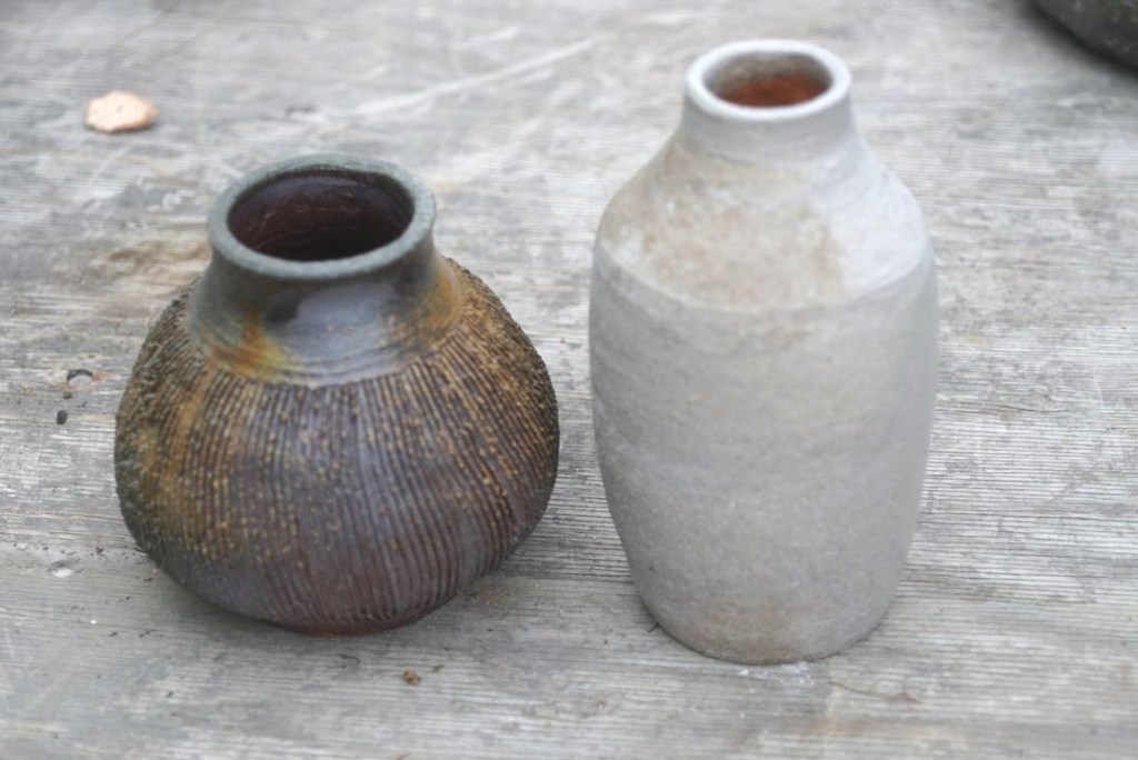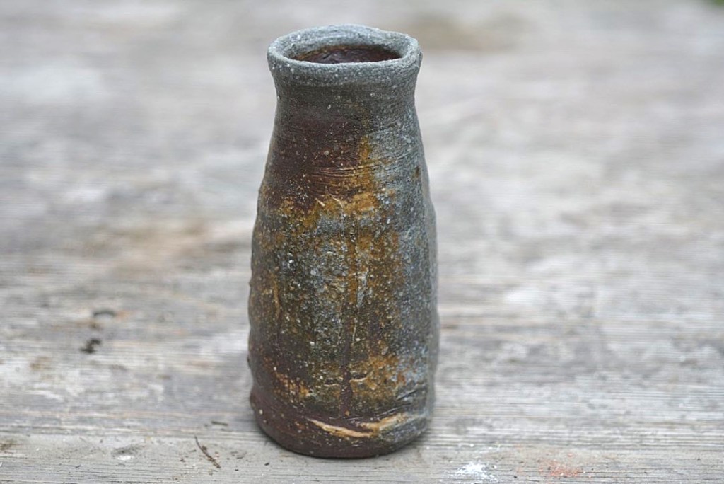 電動ろくろは初心者のうちは背が高いものを作るのは難しいです。仏壇のお供え用の二つの花器、雰囲気が揃っていて赤土に恵那山土灰釉の組み合わせも良いと思います。三つの商品は古信楽に杉と檜の灰を調合した土灰釉で仕上げました。