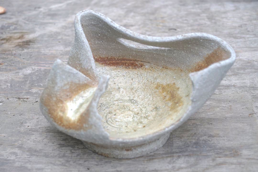 目の粗い白土を使い手びねりで作った作品です。粗目の土にテクスチャーと自然の灰を使った釉の組み合わせが良く調和しています。