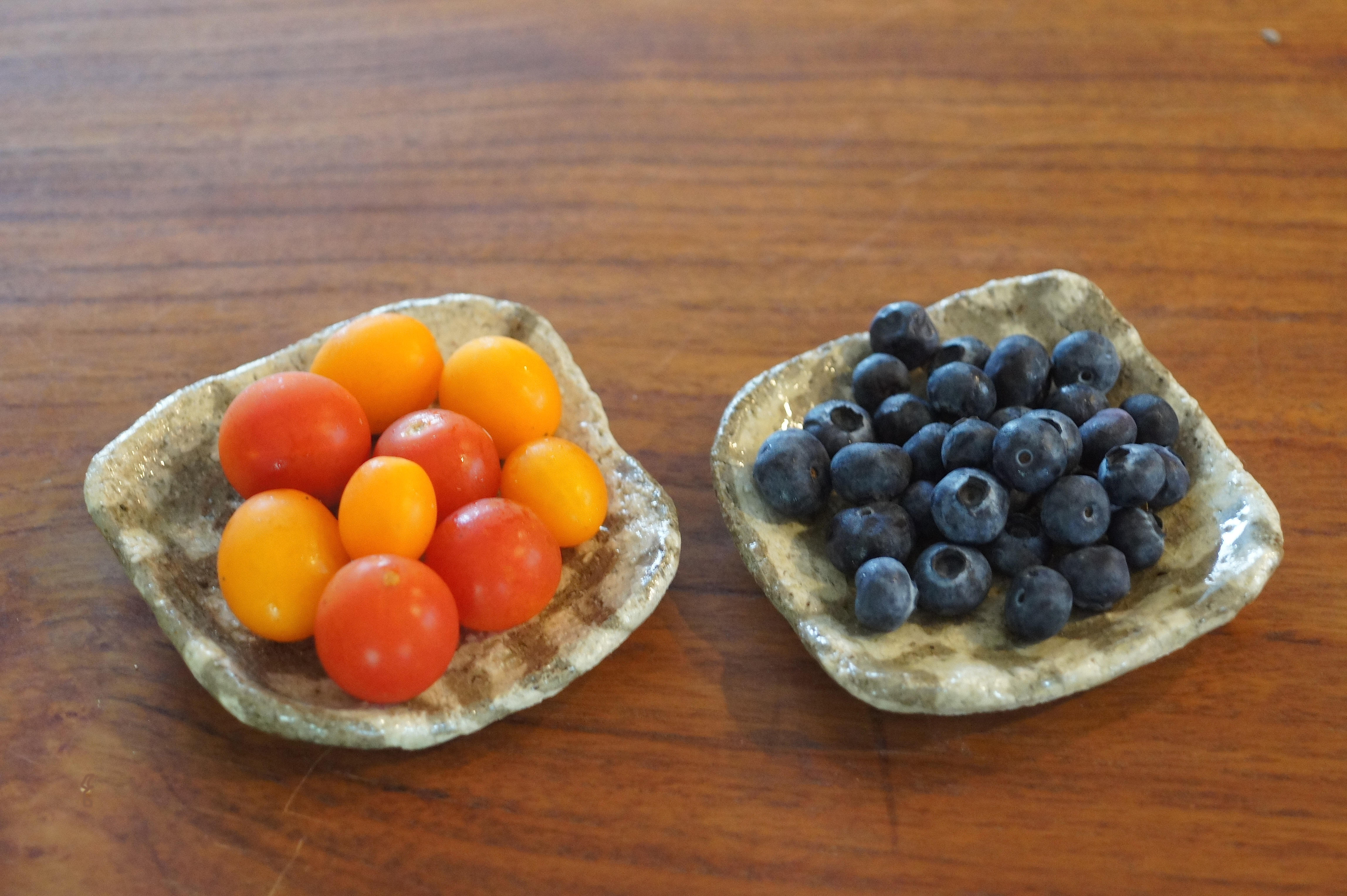 なにができるの? 練り込みによる小皿、プチトマトとブルーベリーを乗せてみました。 青磁の大皿。いろいろな花に合います。 テッセンを絵付けした湯呑みです。 備前の花瓶 備前の花器 板作り、黒化粧の皿 薪窯で焼いた大皿 染付け大皿